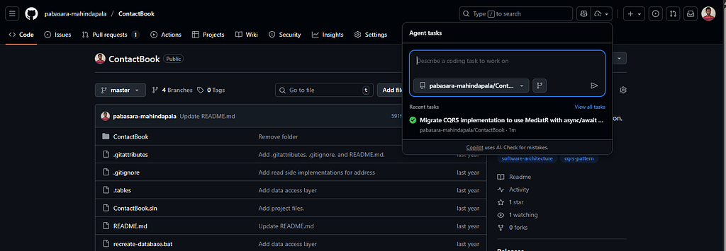 Using GitHub Copilot Agent to refactor my old CQRS implementation to use MediatR with async/await support was a great experience. It handled most of the repetitive work, allowing me to focus on reviewing and guiding the changes while ensuring it stayed on the intended path.