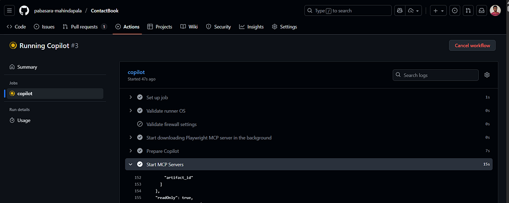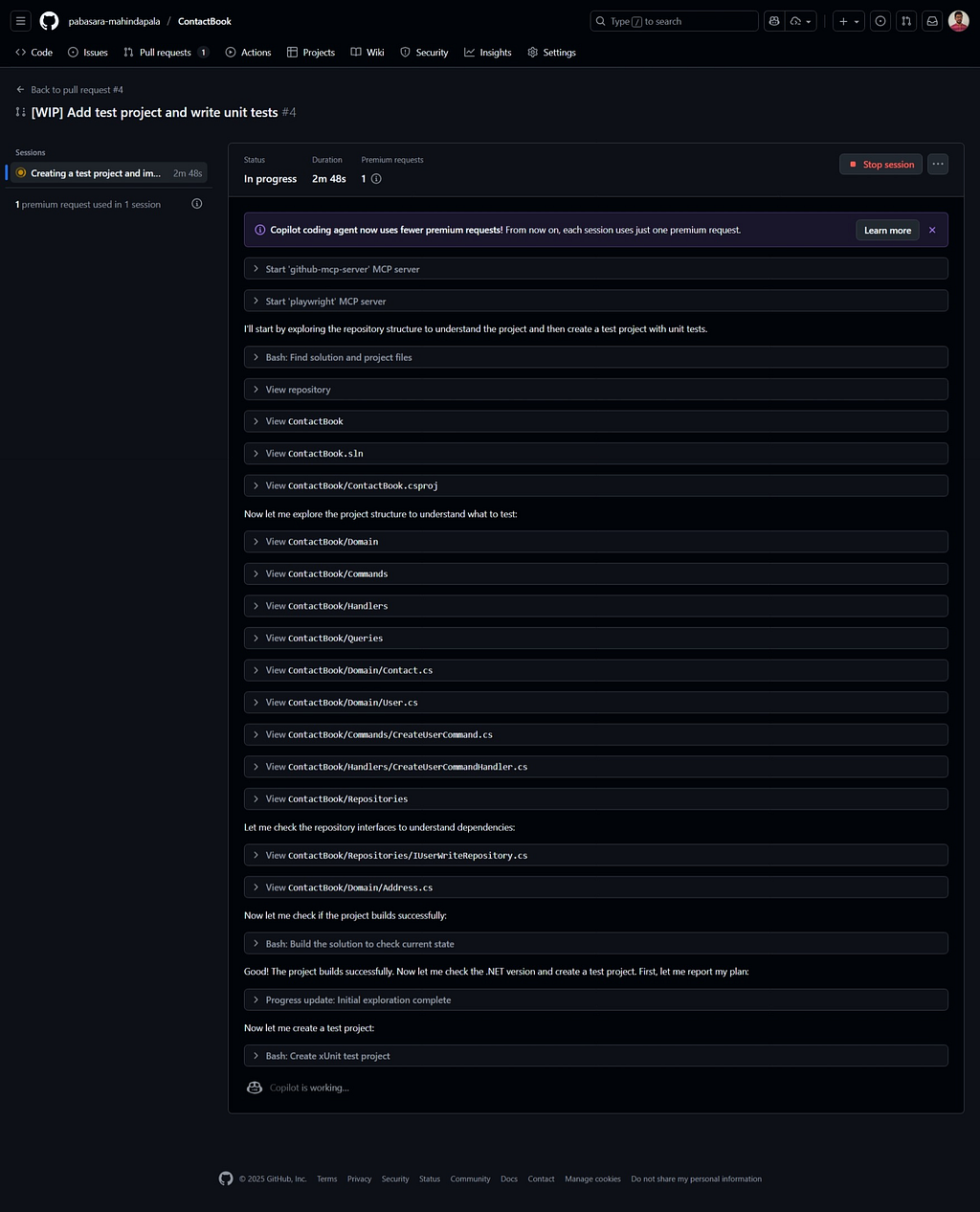 While the agent worked on the initial changes, I monitored the progress through the repository’s Actions page.