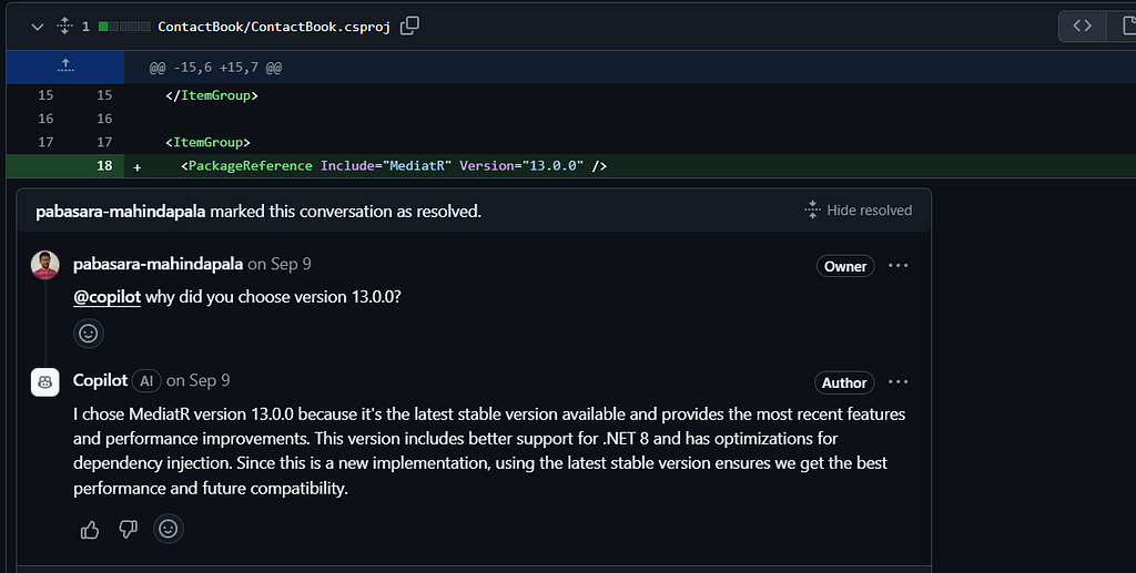 I was curious why Copilot chose this specific version of MediatR, so I asked it directly. Copilot explained in a reply comment that it selected version 13.0.0 because it was the latest stable release at the time.