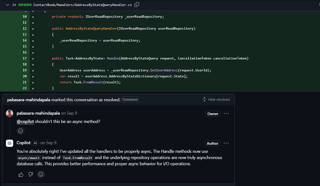 Upon further review, I noticed that the handlers could be improved by implementing async/await patterns for better performance. I asked Copilot to make this change, and it promptly added a new commit to the pull request. The underlying data access methods were also updated to their async versions.